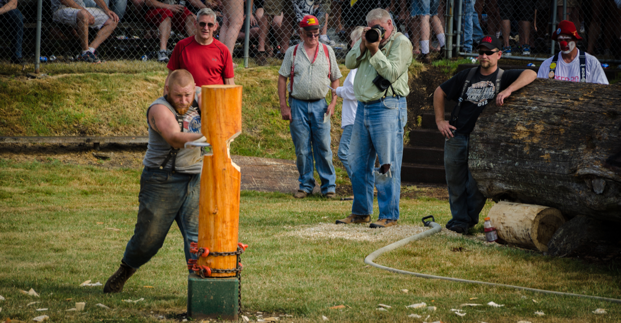 The most difficult event was “tree toping” when you have to climb a pole around 60 feet in the air and then cut off the top layer of the log on top. This is an extraordinarily difficult event. Some people tired so much climbing the pole with a rope that they had little energy left to saw the log at the top once they scaled the whole pole.