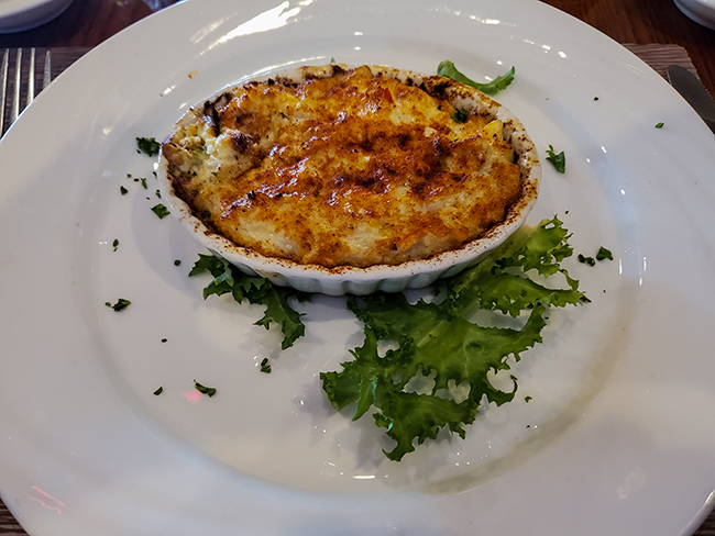 Normally, I tend to eat foods low in fat and high in fiber. However, lunch today was a notable exception. I asked some locals what they thought was the best quality restaurant in the area. While waiting outside the restaurant, I asked some people who spent the summer here what was their favorite item on the menu. They enthusiastically recommended the “baked crab imperial.” So, that is what I ordered and I was not disappointed! It was one of the best meals I have enjoyed in a very long time!