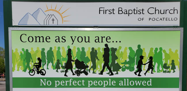 Idaho is certainly famous for their fantastic potatoes!!It is always fun to learn about the local universities when traveling! Before today, I did not know the mascot for Idaho State. Go Bengals!!This is intense and makes visiting teams tremble!I thought it was nice that the city maintained some of the historic characteristics enjoyed by the communityI absolutely love ice cream!! This sign was special to me!This awesome sign is outside a entertaining antique shop in Pocatello. I love small businesses and I especially enjoyed this owner’s enthusiasm!I thought this message outside a local church was very powerful and appropriate. There are no perfect people and we all need Jesus!
