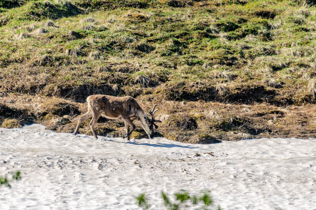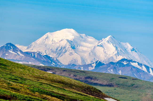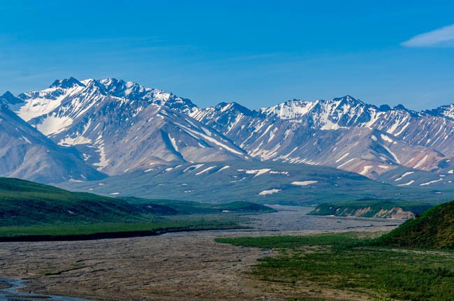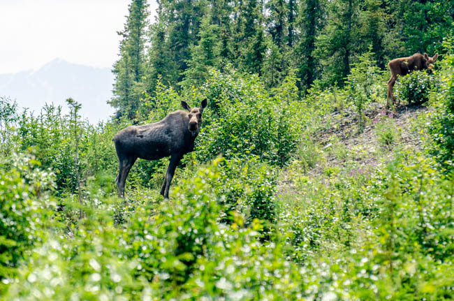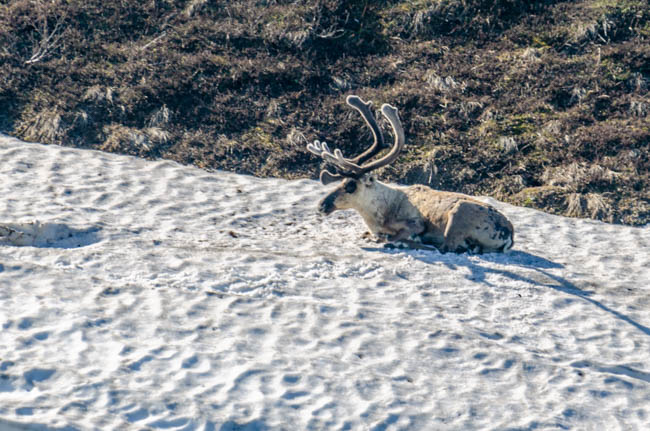Mount Denali is covered by clouds 70% of the time. Our tour today was especially fortunate because it was a sunny day and Mount Denali was not obscured by clouds! Our group is now part of the “30% club!”We saw this moose on our tour too!The mountains in Denali are beautiful!It was a “hot day” by Denali standards with a high in the mid-60s. This male caribou found a patch of snow to lie down and cool off.This neighbor was looking for his own patch of snow so he could cool off too.Back near the visitor center, this mamma moose and her calf were enjoying an afternoon meal.