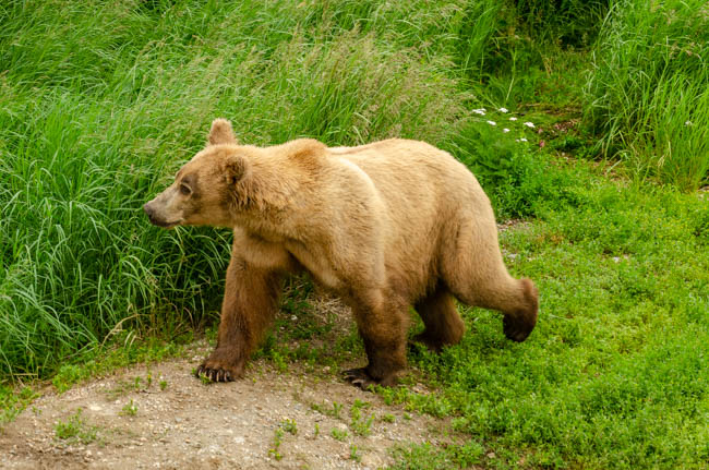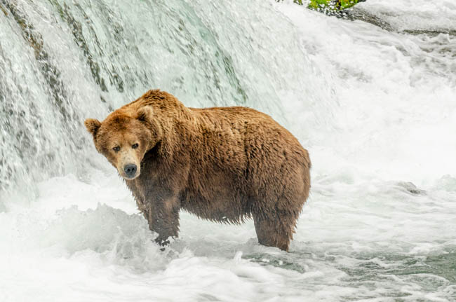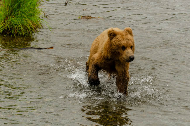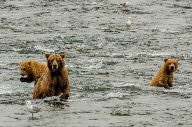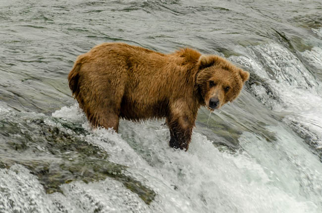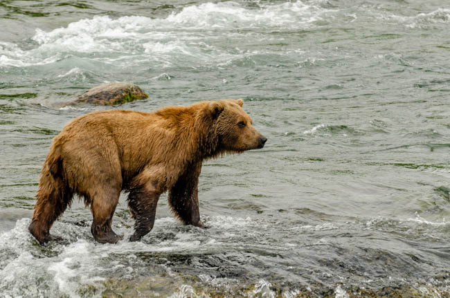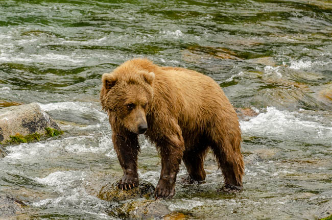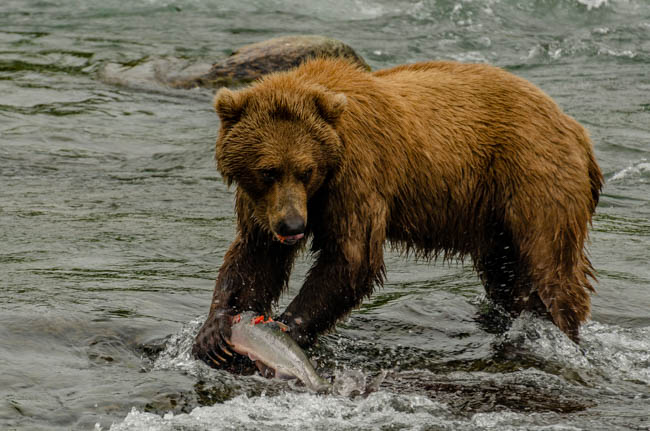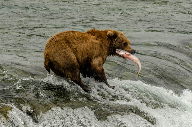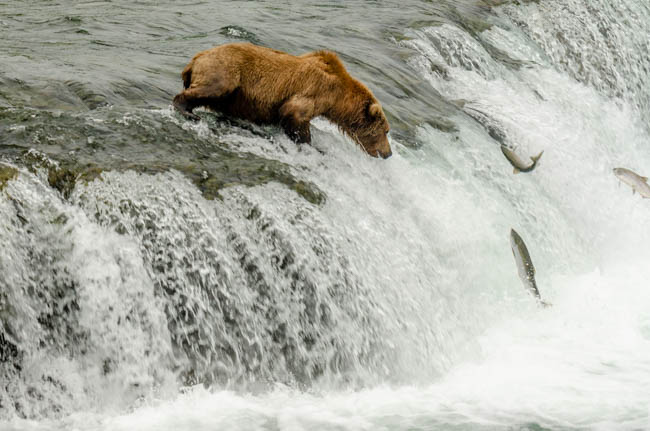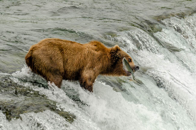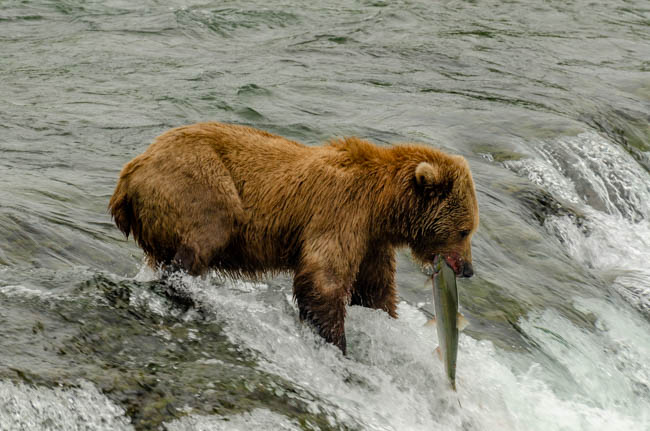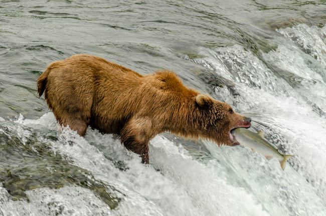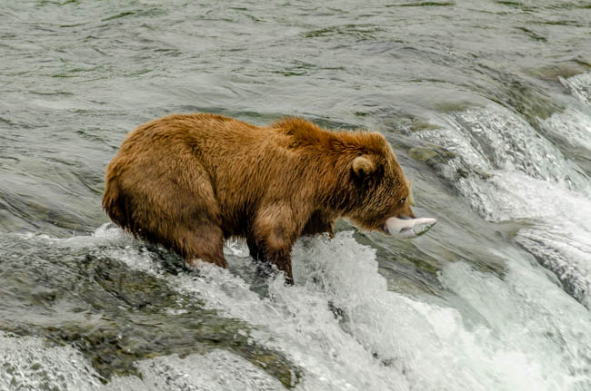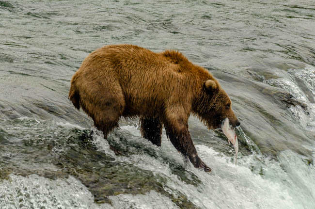 These bears are huge and they own the place!The bear is on the prowl for salmon in the river.He is carefully searching for fish.Look at the size of their claws!!The other bears watch with envy as one bear catches a fish!This salmon was jumping to get over the falls and he survived without being eaten.The search for fish is on!Despite this bear’s best effort, these salmon were out of his reach!This salmon was grabbed out of the air!This bear is tearing bites out of this fish that he caught swimming in the river.This bear has a different strategy. He is standing at the base of the falls and waiting for the fish to get close and then catch the fish as they are getting ready to jump.This bear was successful catching this salmon as it tried to jump over the falls.Another successful catch!Very happy bear!This mom is teaching her two kids how to fish.This bear is on the lookout for more fish!Dinner is served!Baby bear is looking for his meal too.A bald eagle is looking over the scene to see whether he can find any fish scraps to his meal.I was amazed at how well the bears swim. They are fast!This is one of Alaska’s newer volcanoes. This photo was taken from the float plane on the way to Katmai National Park. The cloudiness and early morning light gives it interesting coloring.Here is our float plane that brought us to Katmai National Park. You either need to fly or take a boat to visit this extremely interesting national park.