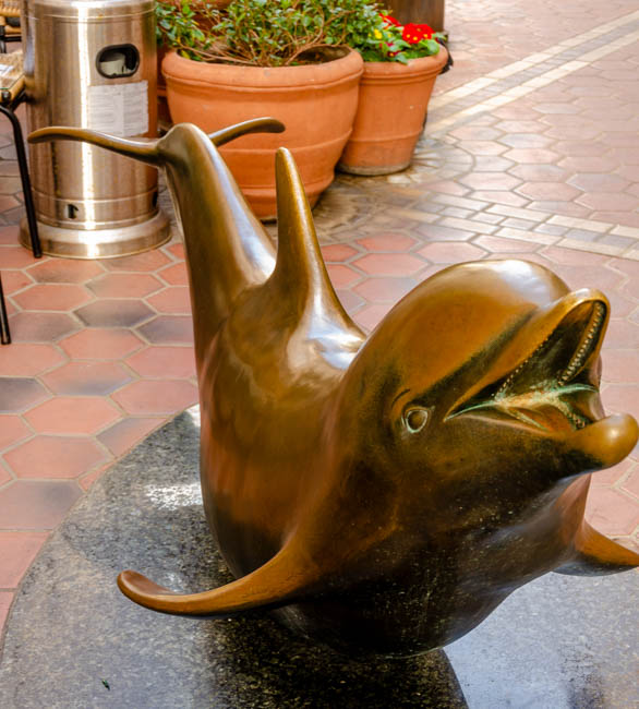Rachel was superb in recommending and tasting wine. She was excellent in identifying and describing the tastes with different wines.There were many wonderful wines to try. These wines are some of the favorites where Elizabeth and Dennis are wine club members.Rachel graciously allowed me to photograph her next to this unique statue. Look closely and it can be seen that the limbs have joints and the arms can be moved. I have never before seen a statue there the arms were movable.I thought it would be quite interesting to share a bottle of wine with this gentleman. Children walking by enjoyed climbing on this dolphin for a ride.It is amazing how long ago Santa Barbara was an important community.The Spanish influence in Santa Barbara has existed for a very long time!!I loved the textures of this very tall, weathered wooden door!
