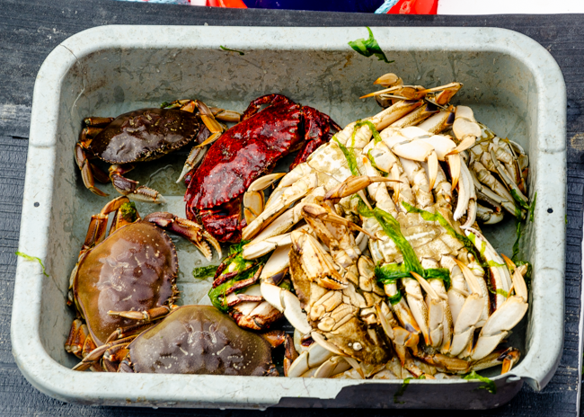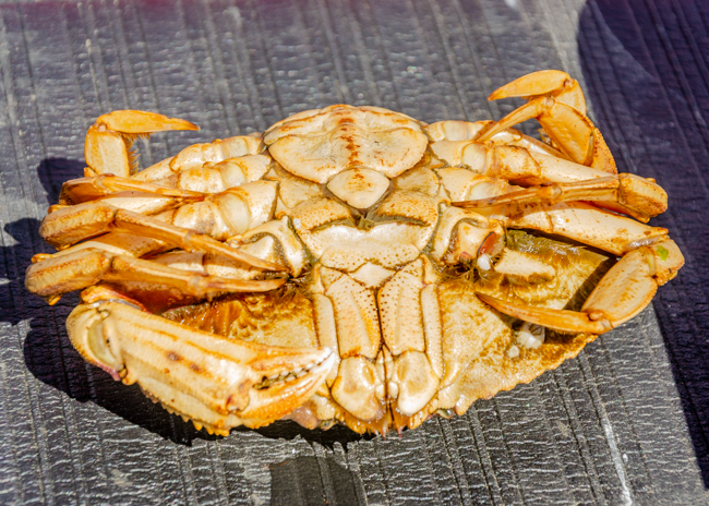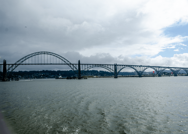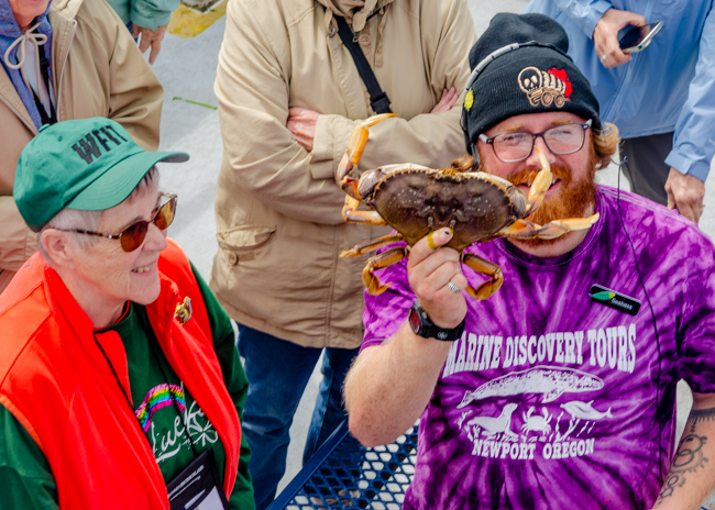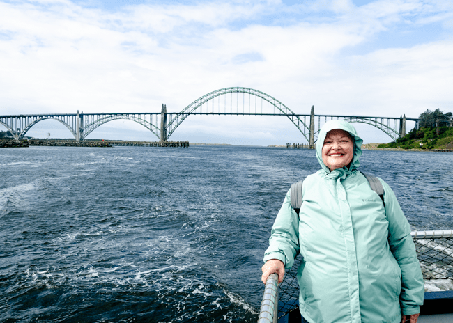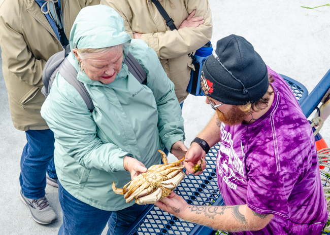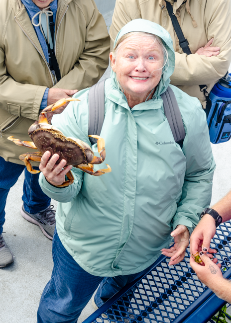 We went on a boat ride in Newport, Oregon and we caught 6 crabs! Charlene was not too sure about holding a live crab as their claws and legs are still moving!!I thought this was a beautiful bridge in Newport!!As we were working our way out to the Pacific Ocean, this powerful Coast Guard boat zoomed past us. Their wake was fun to ride!!I loved all the arches in the bridge! It was cool and windy on the boat, so we were all bundled up to stay warm!Charlene is pointing to a tiny jellyfish we found when the boat simply running a net type filter from the back of the boat. A woman on the boat named him “Grape,” short for grape jelly!!As we rode along in our boat, I was amazed and the dense green trees along the way. Beautiful and rugged!These were the crabs that we caught!! On the ride out, we left two crab traps. On the way back, we picked up the traps and found all these different types of crabs. It was quite amazing to see them move around and maneuver on the table in the boat!!