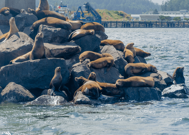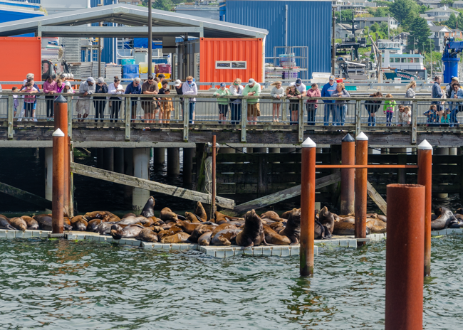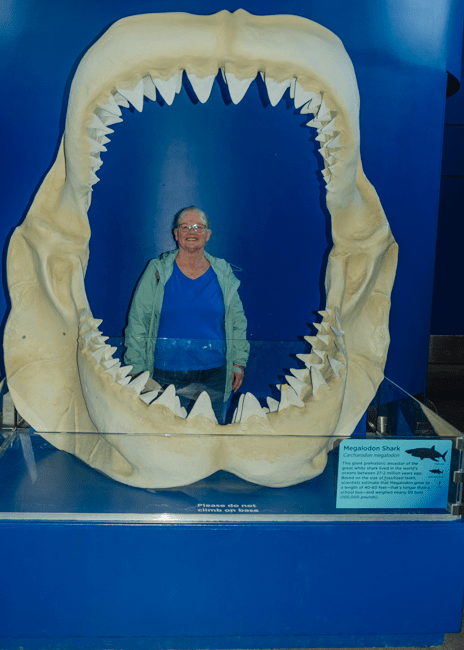 This gentleman told everyone how to safely hold the live crabs. Charlene was not too comfortable with this experience!!It was amazing to catch live crabs!!These flags on our boat were whipping around vigorously with the moving boat and windy day!!After the crabs were caught, we had 8 hours before they needed to be thrown back into the water. The two biggest male crabs were kept.These male sea lions were LOUD!! We could hear them barking from quite a long way away!!People were gathered on this bridge to watch a group of noisy male sea lions!!We later went to an aquarium and were amazed at the size of the megalodon shark!!
