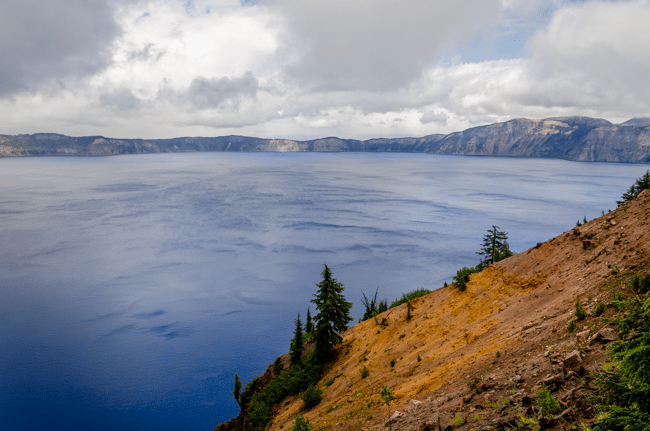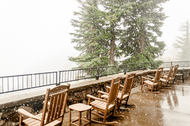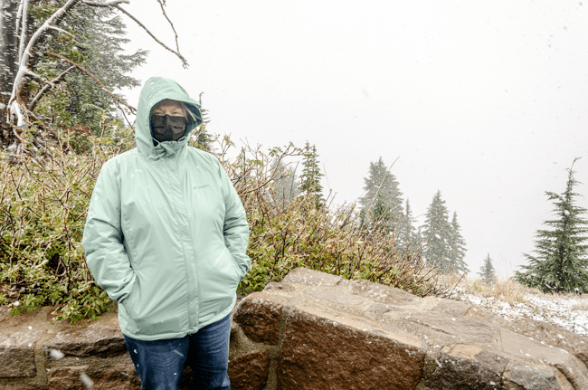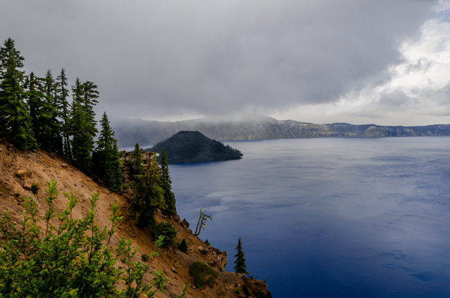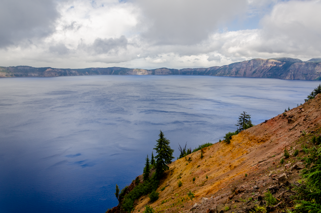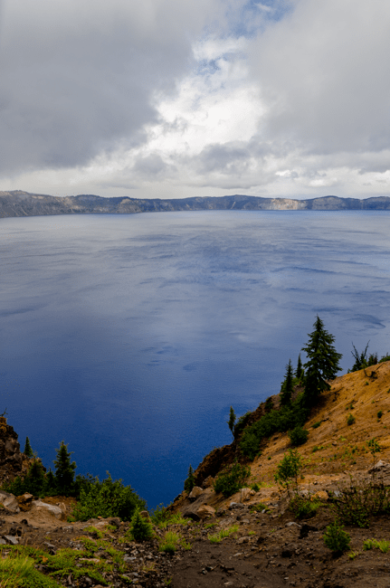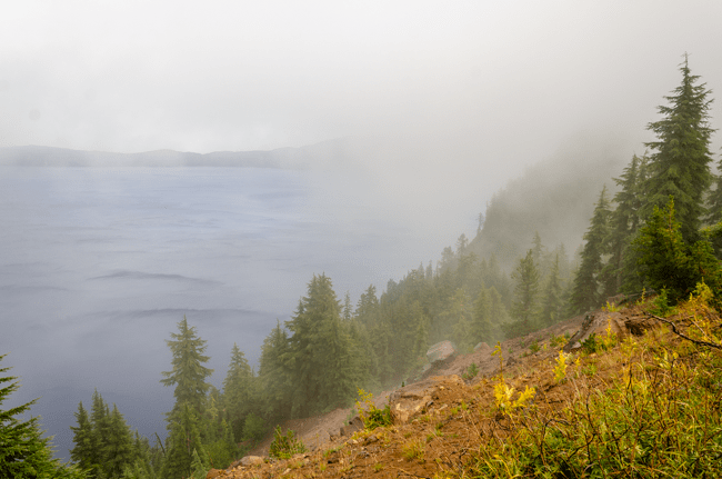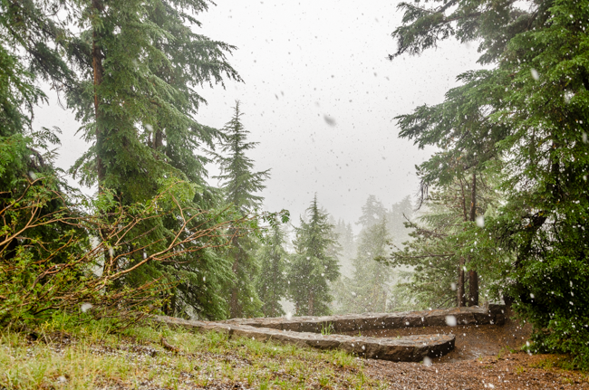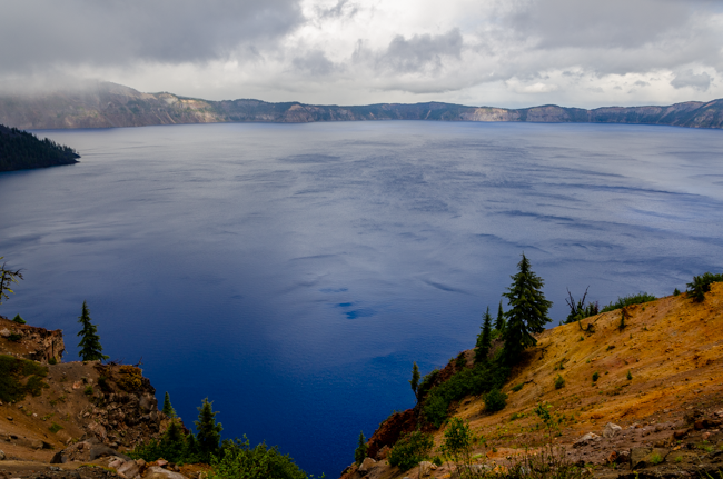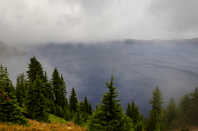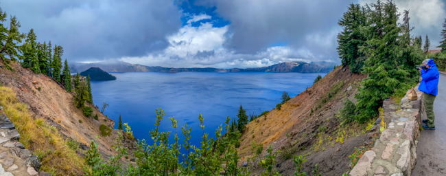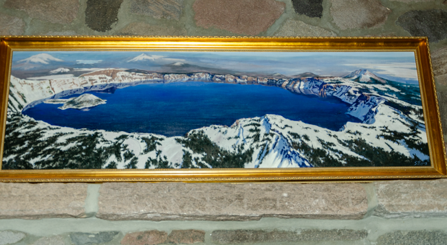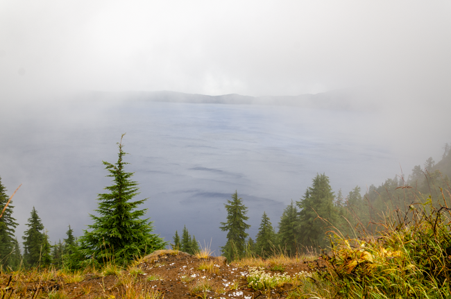 We went to Crater Lake today!! When we arrived, it was a “white out” snow storm on August 23rd!! Later the storm cleared and we were able to see the whole lake!! It was a beautiful experience!!When we first arrived, we were greeted by a huge snow storm!! In the distance is supposed to be Crater Lake, but it was completely hidden by the snow!!The snow was really coming down!! The lake was completely hidden by the storm!!Charlene was almost hidden by the storm!!We kept trying to see the lake, but everywhere we looked there was more snow!!Most of the trees were hidden by the storm too!!There was no one sitting outside the lodge!!I went into the lodge and found this photo above the fireplace. I thought this might be the only view of Crater Lake that we may see.However, the clouds started to lift a bit and we could see across Crater Lake!! We were cheering that we could actually see the lake after our long drive!!We were so excited to see the deep blue waters of Crater Lake!!It was so fun to see the mist, snow, and clouds all around Crater Lake!!The snow next to the lodge was amazing!! This is August!!We had boarded our bus to leave, when suddenly people started shouting that the clouds had lifted further and we had a great view of Crater Lake!! The bus driver found a place to pull over and we ran to the edge of the lake!! What a beautiful view!!The deep blue waters were amazing along with the storm clouds!!I loved all the colors we could enjoy!!Crater Lake is simply amazing!!My friend Connie took a panorama photo using her cellular phone and inadvertently included me in her photo!!