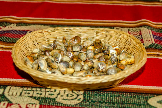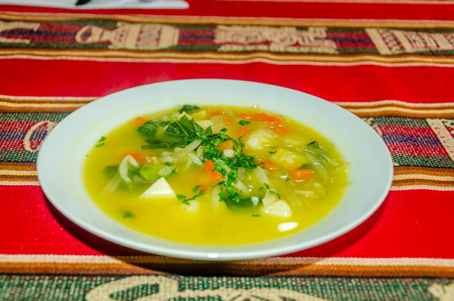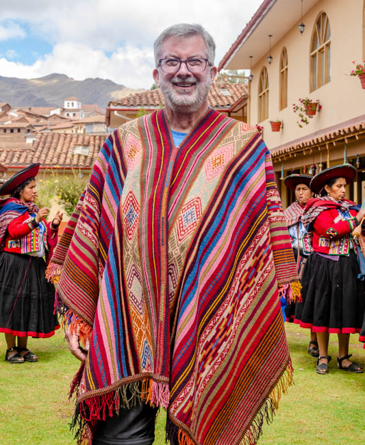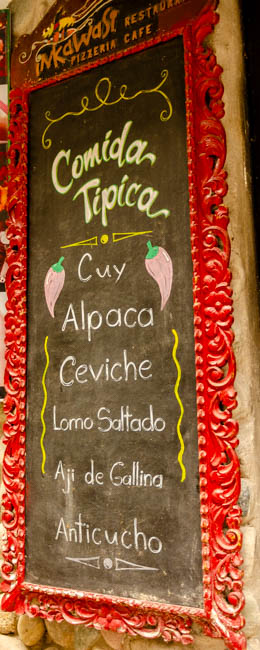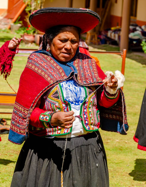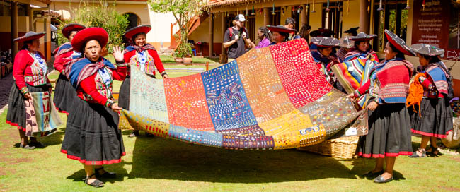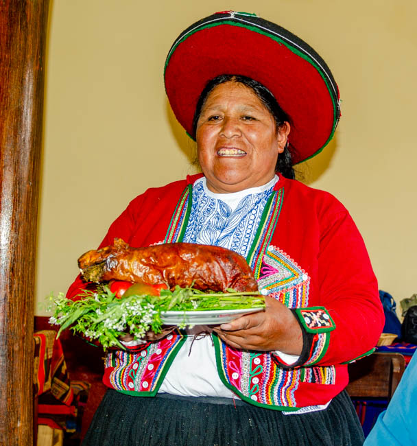 Today was a very fun day!! We drove to Chinchero and watched a demonstration about how these rural women took raw alpaca, lamb, and vicuna wool, died the wool, and then created hand-made items for sale. These women were incredibly talented!! I came very close to buying this poncho!!This is a menu at a restaurant across the street from our hotel. They are advertising the foods available on the menu. Cuy is guinea pig, ceviche is the raw fish in lime juice and spices, gallina is a Peruvian chicken stew, and anticucho is a popular Peruvian meat dish usually made from beef heart. It was certainly fascinating!!This is a statue of Pachacuti. He was the first historical emperor of the Incas. He is highly regarded by the Peruvian people.We ate lunch today in Chinchero. It is high in the Andes at 12,450 feet above sea level!! The air was so thin that one of our travel mates needed to receive oxygen. They served us a wonderful series of foods. This photo is of a fantastic potato soup with a variety of vegetables and spices.On the table was a basket of things we thought was a decoration assortment of rocks. It turns out that these were corn nuts that were dried and baked to make them nice and crunchy. They were great!!This food was a shock! Next, the woman carried in a plate of cooked guinea pig!! Everyone was shocked!! A few minutes after this photo was taken, she served a series of pieces of guinea pig meat. I did not think I would eat it, but once it was sitting in front of us, most everyone picked it up and tried it. The skin was tough, but the meat tasted like pork. I would probably never order it, but a taste seemed not too bad to try.We enjoyed looking at all the products these women created. From ponchos, to bedspreads, to table clothes, these ladies had made some fantastic products!! My favorite aspect was all the colors!!They provided a demonstration of how they began with raw wool, cleaned it, and started to create thread.It was interesting to watch how quickly their fingers moved to get ready to weave the wool.This massive bedspread was the work of 10 different women each making a panel and then weaving all the panels together. It required several months to create it!!My favorite part of the demonstration was how the dying process worked. The showed different plant parts and insects (in the baskets on top of the table) that were crushed, placed in boiling water and then the wool was placed in the mixture. We were shown different product that created the various colors. My favorites with the blues and purples. It was fascinating to watch!!