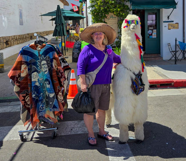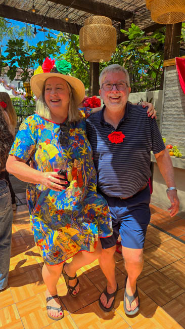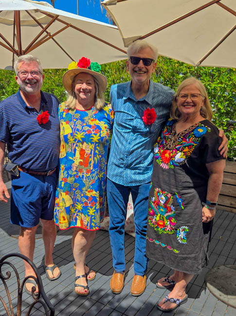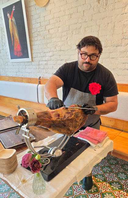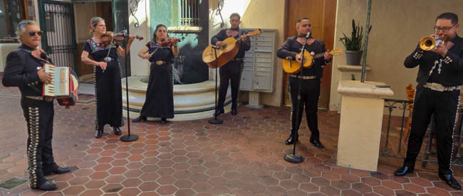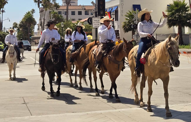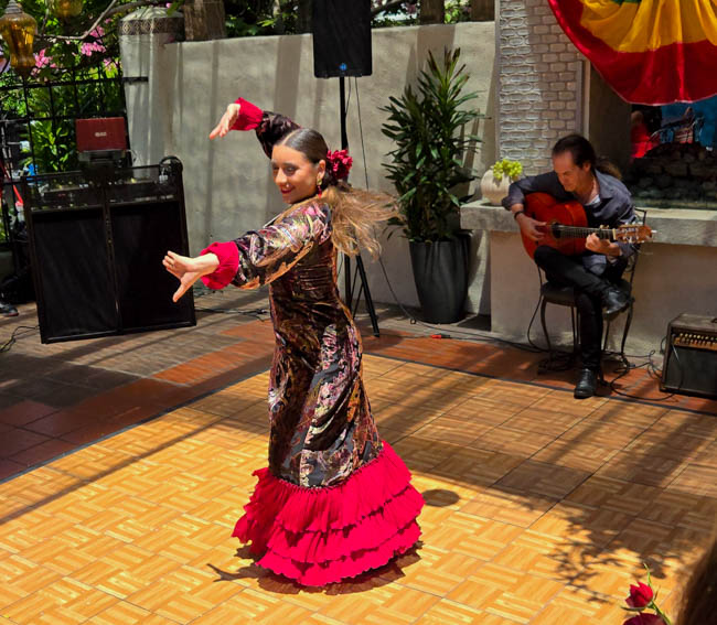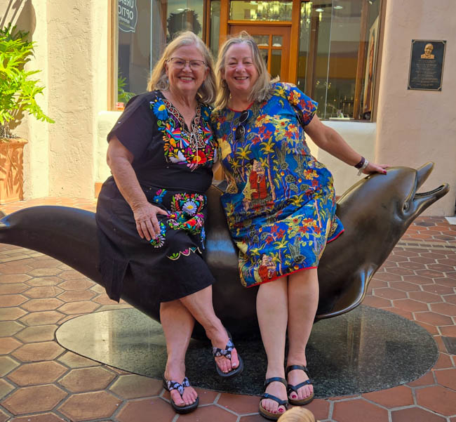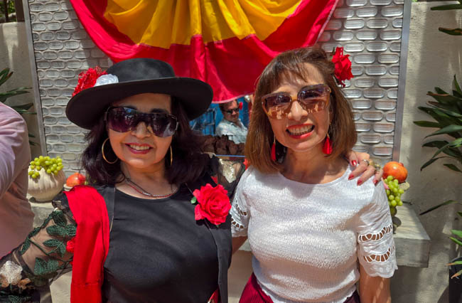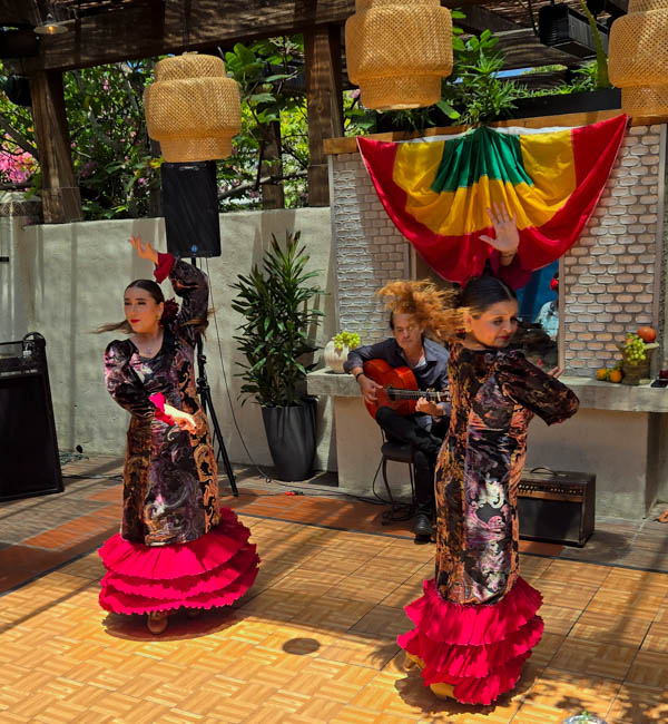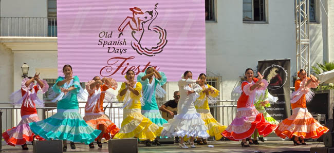 On the stage were all kinds of colorful dresses spinning and turning to the music!! It was so much fun to watch!Ladies getting ready to dance were excited to showcase their dresses!I really loved all the colors in these dresses. Flamenco dancing is serious business!!These colorfully dressed young girls were getting ready to go onstage and dance!!The Spanish colors were flying everywhere around Santa Barbara!!Charlene met a good friend she wanted to bring him home!!When you go to Santa Barbara, it is a requirement to taste their spectacular wines!! Here Rachel and I were enjoying a glass at our favorite wine tasting location!!Charlene and Elizabeth found this great dolphin as we were tasting wine for this special photo!!As we were enjoying our wine, this wonderful mariachi band stopped and played some great songs!! I simply love listening to their music and watching them play. There were a number of mariachi bands playing around the city!!I especially love this photo of Charlene and Elizabeth as we were enjoying our wine!!People celebrate Old Spanish Days by sprinkling confetti on each other!! We had such a wonderful time!!The following day, as we were waiting for the fiesta at Loquita restaurant to begin, these horses walked by to get ready to be in the parade.Loquita had an unbelievable fiesta!! There was unlimited sangria and all kinds of tapas plates of foods to enjoy! They gave us these festive flowers as we entered the restaurant!!This gentleman was carving a jamon (ham) to serve on the tapas plates. It was cooked to perfection!An especially wonderful treat for me was to see Rachel!! She is quite the impressive professional!!It was fun to learn about mezcal and try a number of shots! This is a great product and very smooth!!We especially enjoyed eating the paella!! It required quite a while for it to be prepared, but it was well worth the wait!! We received a ticket for the paella as we entered the fiesta and enjoying it was one of the highlights of the fiesta!!This couple was at the table next to us and I told the woman that I especially loved her hat!!In addition to the unlimited sangria, their bar was in operation for making various cocktails. It was such a fun fiesta!!While we were at the bar ordering drinks, I enjoyed talking with this woman. I especially liked both the confetti and the beautiful white flower in her hair!!These are the special negroni cocktails that Elizabeth ordered! They were a delight to drink!!Everyone was enjoying the fiesta celebration!!A special highlight of the fiesta at Loquita were the flamenco dancers!! It was incredibly fun to enjoy the music and watch the dancers!!It was amazing to watch the moves and grace of these two dancers!!Mother and daughter were impressively moving to the music too!!Brother and sister also had a wonderful time dancing together!! The Loquita fiesta was so much fun!!These wonderful ladies were dancing near us and it was wonderful to take their photo! Everyone had a great time Old Spanish Days!!