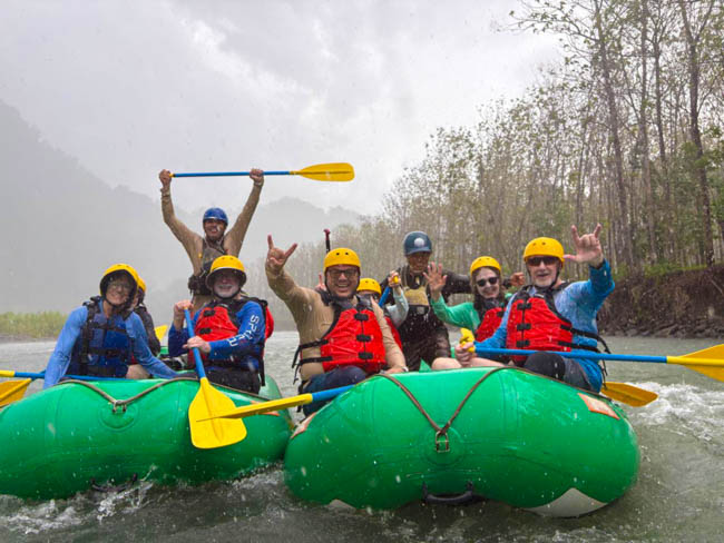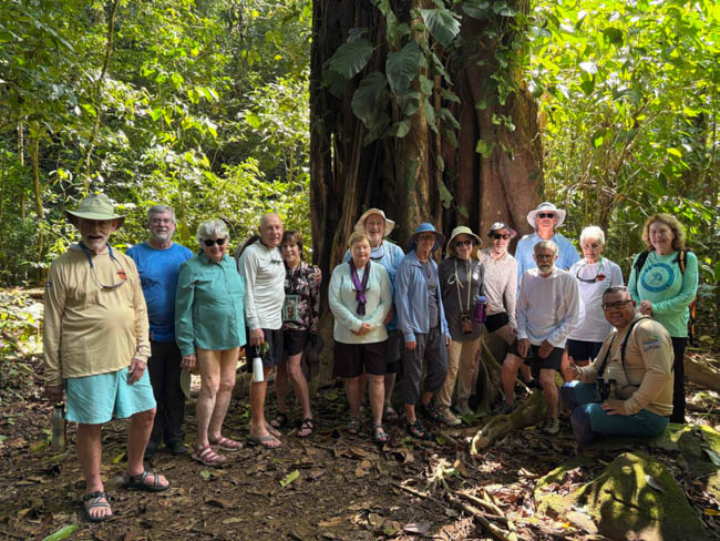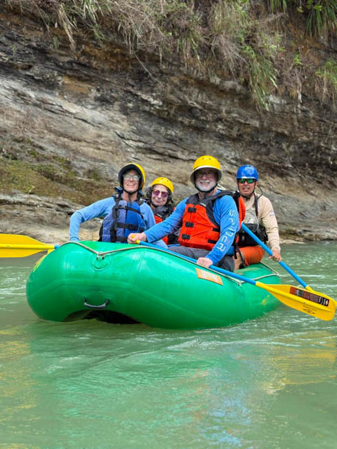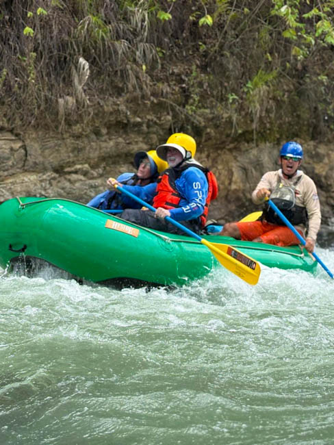 We had an absolutely fantastic time running the river today!! We felt like we were 10 years old as we laughed and splashed through the rapids!! It was so much fun!! I am on the left boat in the front. Everyone has been so wonderful on this trip!!I am grateful that some of the river guides took photos of everyone as we were paddling and trying not to fall out of our boat!!This is my favorite photo of our great team!!Part way through the trip, we stopped at a gorgeous waterfall!! the water was a fantastic temperature!!We ate fantastic Costa Rican watermelon and pineapple on our break. I am grateful that our guide, Danny, took this photo!!We went on a hike through the jungle on our way to the river. We are all still dry in this photo. But not for long!!As we were walking, one of the boat guides saw this owl sitting in a tree near the trail. Fortunately, our guide Danny brought his telescope with the cellular phone attachment to capture this fantastic photo!!The Costa Rican scenery is so beautiful!!This small bugs, that almost look like ants are actually termites!! Our guide told us about them and then he picked one up and put it in his mouth. He said it tasted like carrots!! After that, people waited their turn to grab a termite and eat it. So now I can say that I have eaten termites!! Our guide was correct. They actually do taste sort of like carrots!!The learned about different types of ferns in Costa Rica!! Our guide pick one that was green on the top and silver on the bottom. He showed us that if we put the leaf on our clothes and then taped the leaf that we would have an impression of the fern. I thought it showed up great on my grey pants!!It rained on us while we were on the river. As we were driving back to the lodge, we could see one place where the original river was on the right, and muddy water was flowing down the mountain and into the river. It was interesting to see such a drastic color change!!I understand why people that like birds love visiting Costa Rica!! There are all kinds of birds everywhere!!This guy was sitting in a tree as we drove back into our lodge!!As we were eating, this amazing iguana started climbing up the stone staircase. He lifted his head and looked around at everything! It is simply amazing to see so many unique things in Costa Rica!!