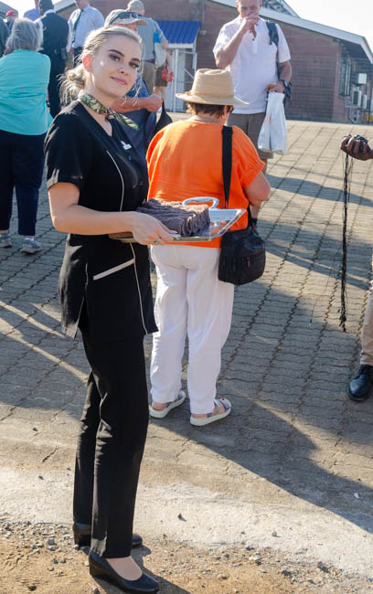 We woke up today in the train station in Mpaka, Eswatini. After breakfast, we met this gentleman named Clement. He was our guide for the day in Eswatini. Eswatini is a small country, but it was great to visit. Clement told us all about the history and culture of Eswatini. He was quite entertaining too. He called cattle walking in the highway an “Eswatini traffic lights.” It was wonderful to talk with him!!We started our day by first going to the Swazi Candles. We watched them make a series of candles by hand. I watched them create an elephant right in front of us.They has a series of talented people making all kinds of candles!!I liked out this globe candle looked like animal skin.I cannot seem to get enough of the African elephants!!We next went to the Mantenga Cultural Village. They recreated a typical Eswatini village and our guide told us about many of their customs.To me, the most impressive aspect was watching the dances and songs sung by these men and women!! There harmonies were incredible and vibrant!The men were intense with their dances!The women’s’ voices were amazing!Here, this man in the center led the other men in a song!The percussion drums were loud and these men were intense in their dance!It was amazing to watch how graceful this woman would move to the beat of the drums!It was unbelievable how high and fast these women would kick their feet. They did it all to the drum beat you could feel in your bones. It was simply amazing to watch them dance!!This guy was the only person dressed like this and he was very focused on dancing precisely to the beat of the drums!This dancer would jump high into the air with a tremendous force with his movement!!It was a delight to watch these dancers move to the beat of the drums!!When these men kicked during their dance, there was power in their movements!!The women quickly followed with their beautiful harmonies! It was mesmerizing!!I really enjoyed listening to this woman when she would lead a part of a song! It was quite beautiful!!These men were very talented!It was such a pleasure to listen to these people sing songs important to their culture!!The music was awesome!!After their performance, they were very happy to talk with me and warmly agreed for me to take their photo!!This woman had a wonderful voice. Sometimes she lead the women in a song and then the other women would follow her words. This woman had an incredible voice!! She is the person that usually lead the women in songs. I am guessing that she was their leader. Afterwards, I told her that I thought she must have the most beautiful voice in all of Africa. She smiled at the compliment. For lunch, we went to the Mantenga Lodge and ate under a covered patio and enjoyed looking at this beautiful mountain. Eswatini may be small, but it is a beautiful country!!After a full day excursion, we headed back to the train (90 minutes away). When we return from an excursion, the train staff always greet us with a cool, moist towel to wash our hands and faces.They next offer us a cool drink!! I always, always select the champagne from South Africa!! It is wonderful and refreshing!!The train staff treat us very well and, literally, give us a red carpet to walk on as we enter the train!! I now understand why people say that train travel is a great way to see Africa. Time for a quick shower and then enjoy dinner that is four courses every evening. One wine with the appetizer, another wine with the main entree, and a desert liqueur. A cheese plate is served just before the dessert. The wines are always from South Africa, while the liqueurs are from around the world. Every day has been amazing!!