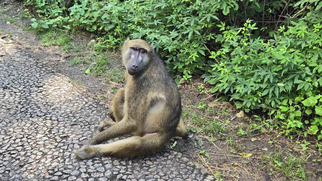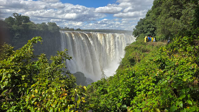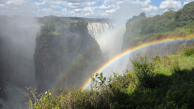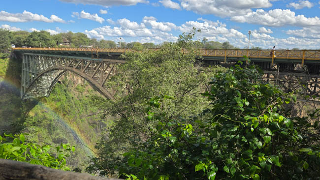 The train arrived in Victoria Falls in the early morning. I was excited to be in the city that is world famous for having one of the seven natural wonders of the world!!We stopped by a local shopping market and talked with people selling various products.This woman showed us how the typical people in the town fix their food. They eats quite a few beans and peanut butter too.I think the foods they sold were quite nutritious and inexpensive for the local population.We worked our way over to Victoria Falls and stared in awe at its size. The falls are 1.2 miles in width and they are much higher than Niagara Falls! We started looking at the falls from one side and we loved seeing the double rainbow!We gradually kept walking and kept seeing new sections of waterfall. I really liked the rainbows too!!The more we walked, the more new sections of waterfall that we found. You can see people on the right of the photo that gives a little perspective on the size of the falls!!The force of the water was amazing!! It created a huge amount of mist. In several places you could see nothing except mist!!This bridge is very close to the falls. Zambia is on the other side of the bridge!Believe it or not, but people actually put on a harness and them jump off into the midst! No thank you!!As we continued on the path, we were greeted by these to adult warthogs!!This baboon moved fast, but seemed to be content to watch us pass by. We were warned by our guide to make sure we did not have any food in our pockets. He said baboons can smell food and would quickly put their hands down our pockets to steal the food!This baby baboon was very cute!!