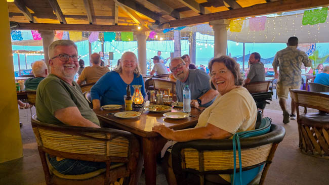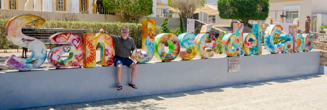 We could not stay away from having another trip to see El Archo!! This time we were on a tour using a completely clear boat!! It was great to see all the fish as well as visit the arch!! Charlene was not too excited to be leaning over the edge of a boat that was moving up and down with all the waves from nearby boats!! We had a great time!!This is Pedro!! He basically lives in the marina in Cabo San Lucas and the boats go by and say hello to him!Two cruise ships joined us in Cabo San Lucas this morning! They were so huge!!Every type of boat imaginable was near the arch for scuba diving, snorkeling, or sightseeing!!This was a very popular location for snorkeling!!We loved being on a boat that was completely clear!! We could see so many fish!!This is another beautiful view of lovers beach!! Divorce beach is just on the other side with the rougher Pacific Ocean waves,This is the “Ventana a la Pacifica” It is the window view from the Gulf of California to the Pacific Ocean on the other side. Today our boat was a bit closer, for a nicer view than a few days ago.I love this view of El Archo!! It is so beautiful!!This lady was the first in our group to volunteer to go to the front of the boat for a photo, sit on the narrow edge of the boat, and enjoy the boat moving up and down with the waves!!Charlene did not enjoy the movement of the boat. Her smile is a little forced! But we had so much fun!! I love my wild and crazy socks from participating in the Turkey Trot a couple of years ago!!Hold on to the boat for dear life!!On the way back we saw the cruise ship giving people rides in this crane that went up into the air! What an amazing experience they were having!!There is some serious money in some of the boats in Cabo San Lucas!!We saw this sign as we were walking around the marina. I thought it was cute!!Cabo San Lucas has great food!! This famous Cabo sign is everywhere!! From t-shirts, to mugs, to artwork. We had to have our photo taken with this landmark!!These ladies knew how to have a great time with customers!! They thoroughly enjoyed trying to get customers to buy a series of tequila shots. We laughed with them, but bypassed the shots.This is the restaurant where we ate. Their food was wonderful!!This was my carne asada burrito!! I do not think I have every had fries with a burrito, but I enjoyed them both!These were the carne asada tacos!! The flavors were wonderful!!This woman was not too excited to have a live iguana sitting on her shoulder!!This guy was much happier to hold the iguana!! However, his mother was much more skeptical about the creature!!Cabo San Lucas is a vivid and fun place to visit!!