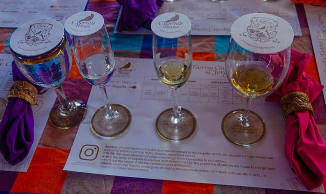 We had a wonderful experience attending an amazing and sophisticated tequila tasting experience with Jorge Cuervo, Jose Cuervo’s great grandson!! Charlene, John and myself had a fantastic evening completing the tasting, learning about the history of tequila, and learning how to correctly drink tequila!! Jorge is a ninth generation in the Cuervo family!!We had the tequila tasting and we also ordered dinner afterwards. We thoroughly enjoyed the evening!!There are so many tequilas in Mexico!! Some have very elaborate bottles and many people like to take them back to the U.S.!!I liked tasting the tequilas, but I also enjoyed looking at all the elaborate packaging!!These were the three tequilas we tasted. The far left was water to use between tastings. The first tequila was a blanco tequila. The second was a reposado tequila, and the third was an anejo. The blanco is the tequila right out of the distillery, the reposado was aged for at least two months in an oak barrel, and the anejo was aged in a wooden barrel for at least one year.This was an example of a quality blanco tequila that we discussed.Jorge taught us the three key attributes that we should check for when buying tequila: 1) the tequila bottle should say “tequila.” This describes the designated geographic tequila region (Jalisco) as regulated by Mexican law. 2) the tequila should state “100% agave” was used to make the tequila. And 3) the tequila should have the “CRT” certification by the Tequila Regulatory Council. Unfortunately, some well known tequilas, e.g., the common Jose Cuervo available in the U.S. are only 51% agave, and 49% are non-agave sugars. Jorge suggested that since the common Jose Cuervo we see in the U.S. is not 100% agave, we may prefer drinking tequilas that meet these 3 important criteria. Other higher-end Jose Cuervo products may be made with100% agave and it was suggested we may prefer drinking those. If a tequila bottle does not state the proportion of agave used, we should check the company’s website.This is an example of tequila where it is clearly seen on the label that 100% agave was used to make it.These are the two tequilas that Jorge has made. The front label clearly indicates the name “tequila” and this label states 100% agave was used to make the tequila. The label on the back of the bottle clearly has the “CRT” certification. The small bottle on the right is the blanco tequila that could be brought into the US in carry-on luggage. The larger bottles can be brought into the US in checked luggage. We bought the reposado bottle and Jorge signed the back label for us!! It was very fun talking with Jorge Cuervo. He told us about his three kids. He said that in his home, it is “required” that they only speak English. He wants his kids to be fluent in English and comfortable with talking with people from many different countries. One of Jorge’s boys was at the restaurant and we enjoyed talking with him. Jorge is often flown to cities in the U.S. to provide tequila tasting demonstrations at various business conventions. This display is in the restaurant and summarizes his family history. Jorge named his tequila “Malaco” after one of his relatives. Malaco means Malachi in Spanish. After completing the tequila tasting upstairs, we went downstairs to the restaurant and had an amazing meal of Mexican food. It is difficult to see under all the cheese, but we had chicken enchiladas, tamales, flank steak beef, chili rellenos, tostadas, taquitos, and guacamole. There was so much food, the three of us could not finish it all!! Everything was so delicious!!It was very difficult to decide what to drink with our dinner. We could have picked a straight tequila, a margarita, or a range of different tequila cocktails. We all picked a different flavor of margarita. This was a fantastic mango margarita that I selected. The flavors on the rim and the top were quite spicy!After our tequila tasting and fantastic meal, we walked a few blocks to the weekly “art walk” that is held in the main plaza in San Jose del Cabo. All kinds of artists had their work on display. Here Charlene and John are looking at all the paintings one woman created. It was fun to see such a range of artistic talent!!I am not sure about this gentleman’s costume, but I think he is dressed up as an Aztec.Next to the plaza is a well-known church in San Jose del Cabo. I liked the silhouette of church with the setting sun!!The art walk had many truly amazing paintings!!All the colors and designs were amazing to see!!A black lighted highlighted the vivid colors with these designs!!I think my favorite aspect about all the artwork was the vivid colors that were used!! Mexican art is so beautiful!!