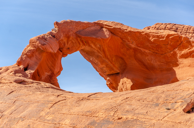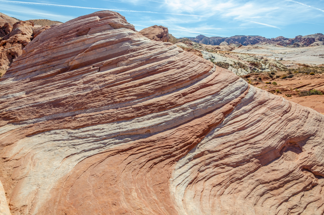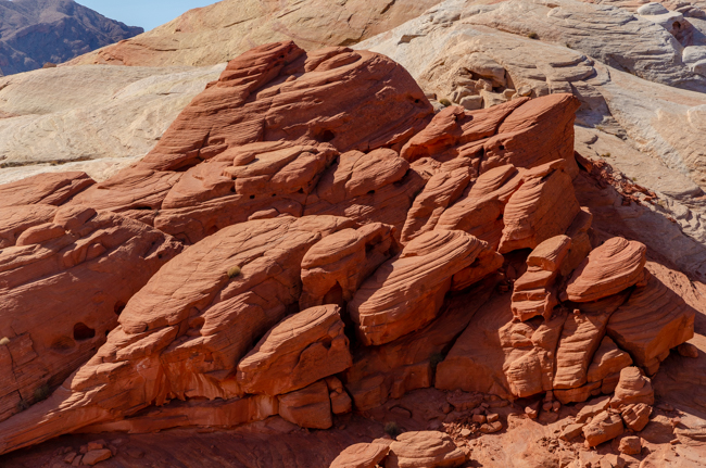 I found a campsite inside the park, left some chairs out to save my campsite, and then went to the visitor center. I was told the hike to the “Fire Wave” was the most popular hike in the entire park. I jumped into our motorhome and went to the trailhead. What I discovered were many rich red-orange-colored rocks. Some rock contained multiple layers of different colors of rock. I had a wonderful time taking photos in directions all around me!
