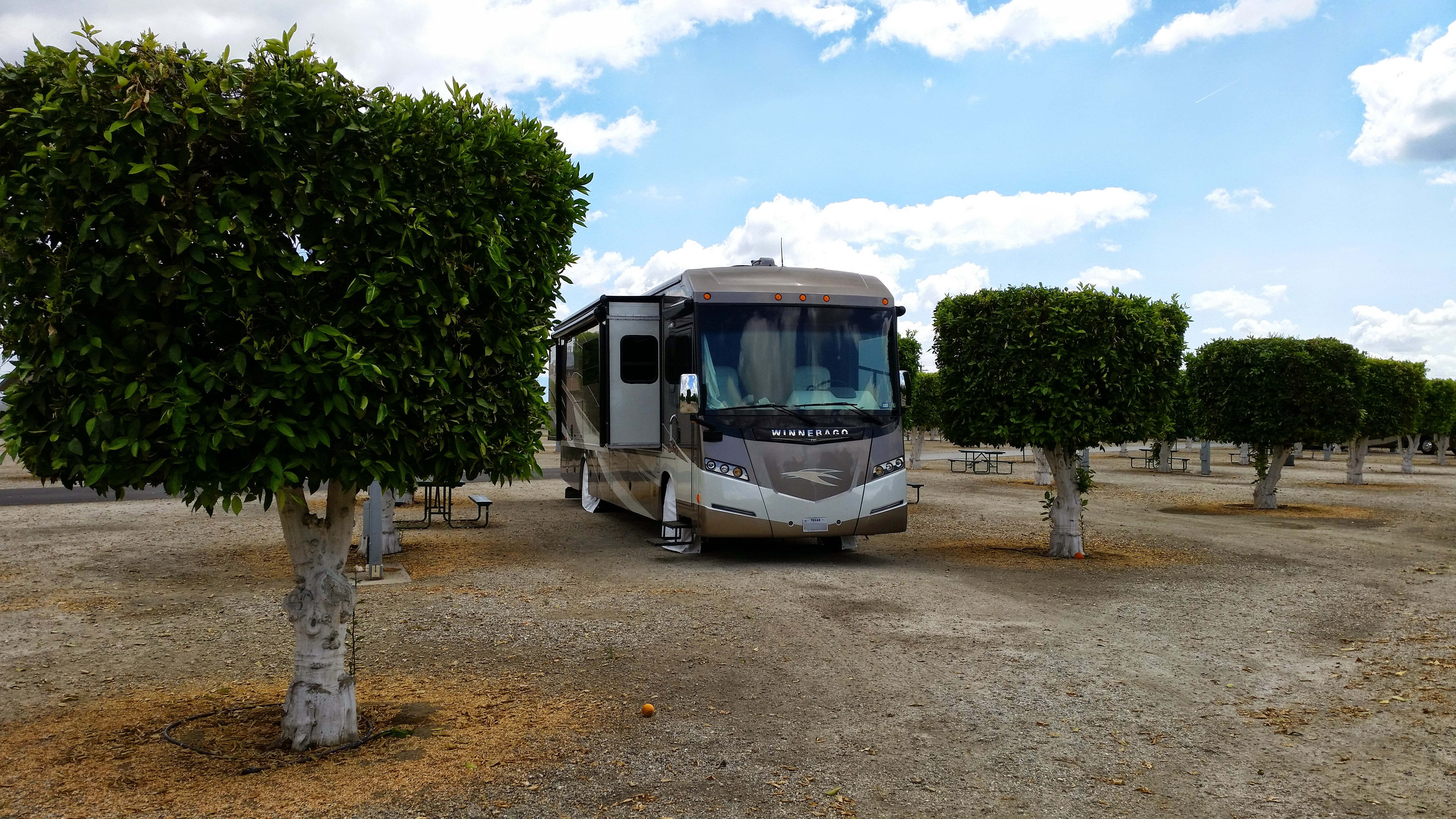 After the conference call was over, we headed into Bakersfield and pulled into our RV park that was built right in the middle of an orange grove! With the trees beginning to blossom, it smelled fantastic! The sites were nice and wide and long, so we had quite a bit of room all around us.