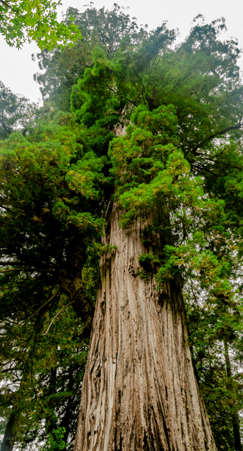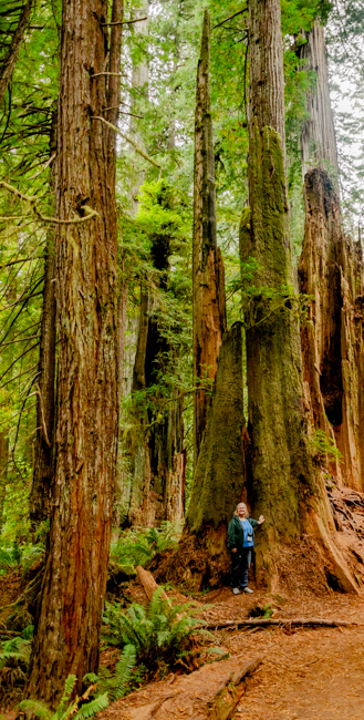 These redwoods are huge!! Standing in front of a large burned section show that the remainder of the tree is alive!!We drove down into northern California (near Eureka) and visited Humboldt Redwoods State Park!! This is a beautiful forest of coastal redwoods!!The coastal redwoods are taller than the redwoods near Yosemite!Our tour director (Susan) and I could barely reach the diameter of these trees!!The deep texture of the wood and bark is amazing!!The trees as so tall, I had trouble capturing their height with my camera’s wide angle lens!!I enjoyed looking at the deep bark with moss growing all over the trees!!This is more of a close-up photo of the mass growing on the trees!!This amazing root system looked like a roaring fire to me!!The texture of the trees was so interesting!!The ferns grew everywhere along with the redwoods!!Susan was dwarfed by the size of the root system!!The depth of the ridges in the bark was impressive!!The texture of the cracks and ridges in the bark was interesting!!The light making it through the redwood canopy created a spotlight on these leaves growing on a fallen redwood!!